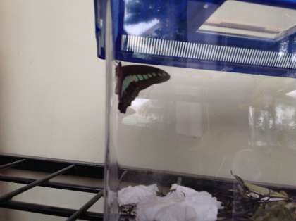 以前、さなぎになったとお伝えしたアオスジアゲハが立派な蝶になりました。