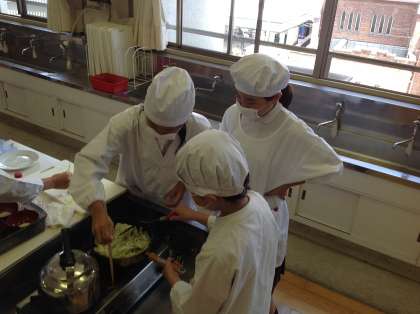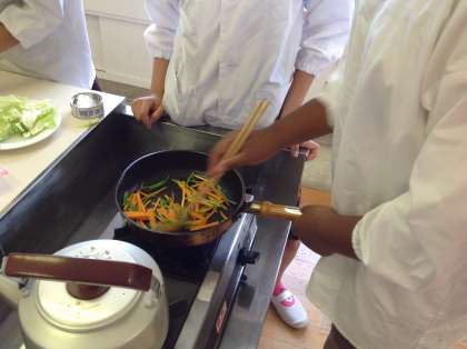 家庭科の調理実習で、三色野菜炒めと、中華スープをつくりました。