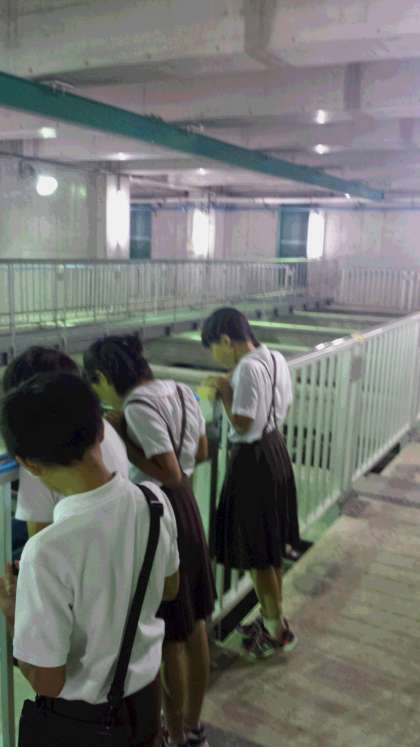 下の写真は、沈殿池を見学している様子です。