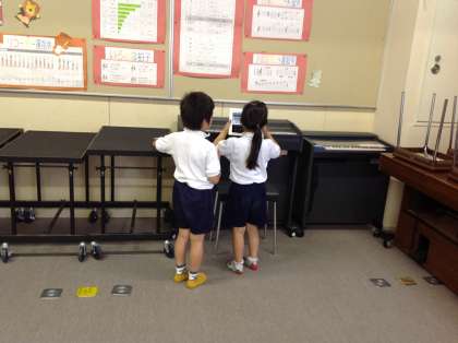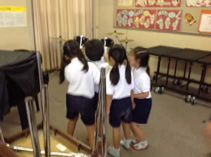 音楽室に来た子どもたちは、たくさん楽器があることに驚いていました。