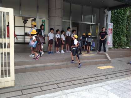 朝、玄関に立って代表委員会の子どもたちが