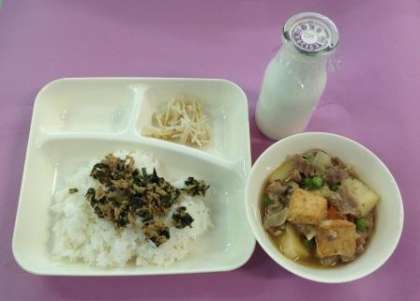 今日の給食は「ご飯、牛乳、豚肉とあつあげの煮もの、もやしのゆずの香あえ、ツナわかめそぼろ」です。