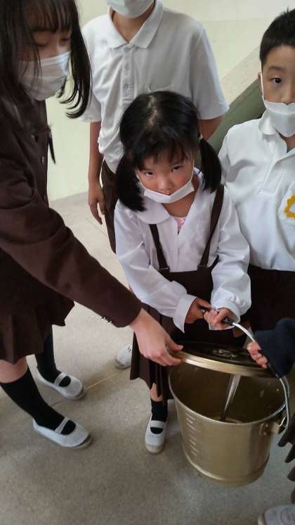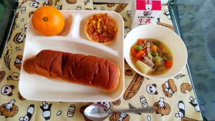 豚肉と野菜のスープ煮、変わりピザ、みかんです。