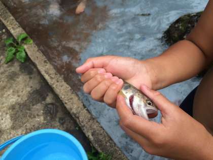 雨が降ってきましたが、魚つかみスタートです。子どもたちも必死!魚たちも必死です!