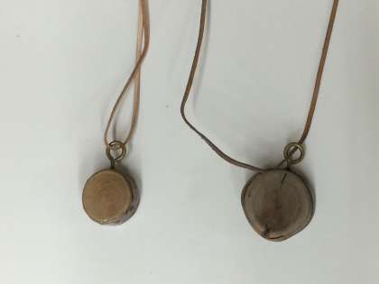 木の枝を輪切りにしたものをサンドペーパーで削り、ペンダントにします。写真の作品は見本です。さぁ、上手に作れるかな?(20時)