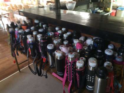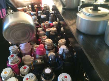 アサヒロッジの方が用意してくださった大量のお茶を水筒に分けました。これを持って、今日は登山です。朝ごはんの準備も始まりました。