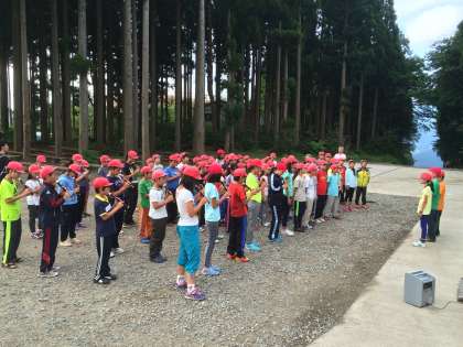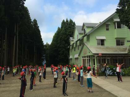 すがすがしい空気の中、歌ったり、体操をしたりしました。5年生みんな元気です。
