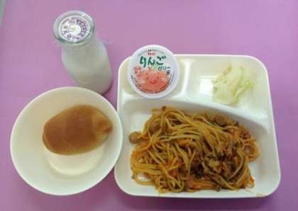 今日の給食は「黒糖パン、牛乳、イタリアンスパゲッティ、キャベツのピクルス、りんごゼリー」です。