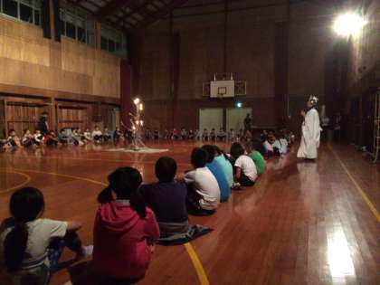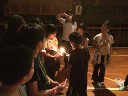 火の神のお話を聞き、神様から授かった大切な火を、1人1人のろうそくに分けていただきました。
