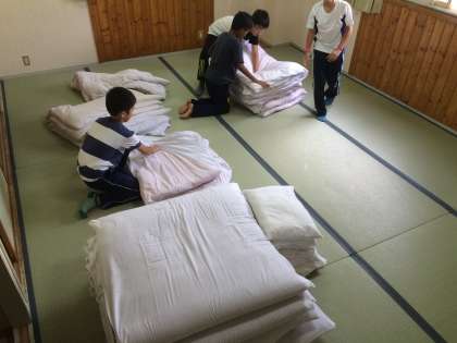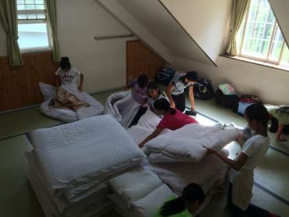 荷物や布団の整理をしています。アサヒロッジの方へ感謝の気持ちをこめて、部屋をピカピカにします。みんな、一生懸命です。