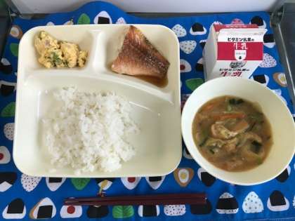 あかうおのしょうゆだれかけ、みそ汁、えんどうの卵とじです。