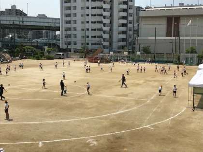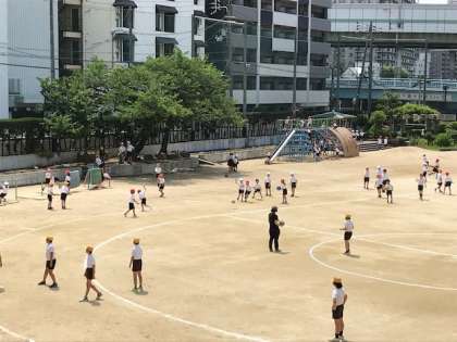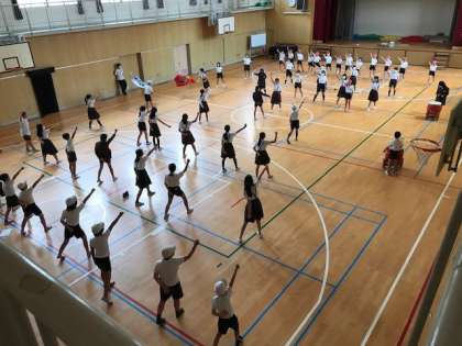 運動場で元気に遊んでいますが、講堂では応援団が練習しています。
