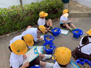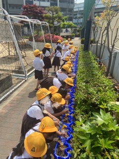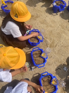 先週、種をまいたアサガオの芽が出てきました。水やりや観察も頑張っています。