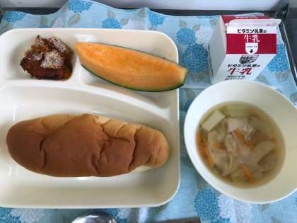 かぼちゃのミートグラタン、鶏肉と野菜のスープ、クインシーメロンです。