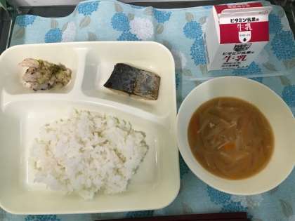 さごしのつけ焼き、みそ汁、キャベツの赤じそあえてす。