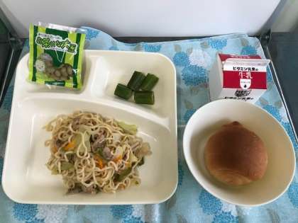 和風焼きそば、オクラの甘酢あえ、まっ茶大豆です。