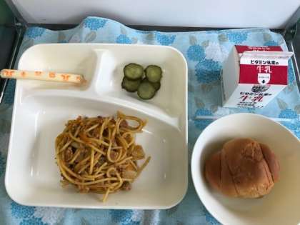 カレースパゲッティ、きゅうりのピクルス、棒チーズです。