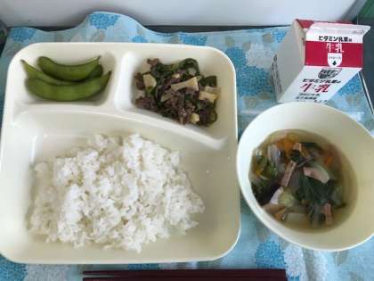 チンジャオニューロースー、ハムと野菜の中華スープ、えだまめです。