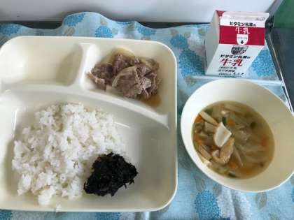 豚肉の甘辛焼き、五目汁、のりのつくだ煮です。