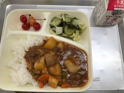 ハヤシライス、ミックス海そうのサラダ、さくらんぼです。