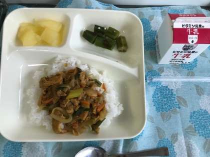和風カレー丼、オクラのかつお梅風味、りんごです。