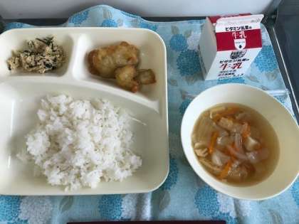 白身魚フリッター、すまし汁、とりなっ葉いためです。
