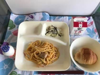 チキントマトスパゲッティ、キャベツのひじきドレッシング、発酵乳です。