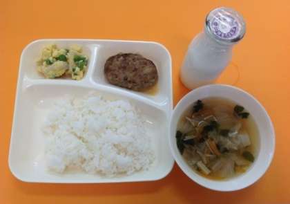 10月最初の給食は「ご飯、牛乳、和風おろしハンバーグ、すまし汁、高野どうふの卵とじ」です。