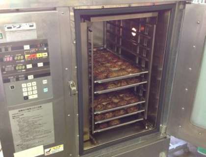 ハンバーグは、焼き物機で焼いています。今日は、だいこんおろし、ゆず果汁、みりん、うす口しょうゆで作ったたれをかけ、ご飯に合う味つけに仕上げています。