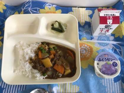 ビーフカレーライス、野菜のピクルス、ぶどうゼリーです。