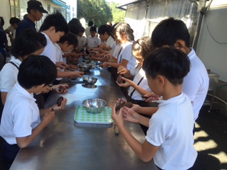 昼食は、海鮮バーベキューと釜飯です。釜飯に入れる貝を、取り出す作業をしています。