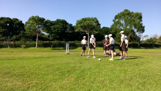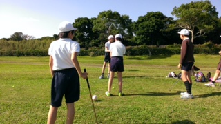 グランドゴルフをしています。芝生が気持ちよさそうです。
