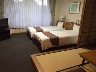 本日宿泊するホテルエクシードの部屋です。和室と、ベッドが2つあります。