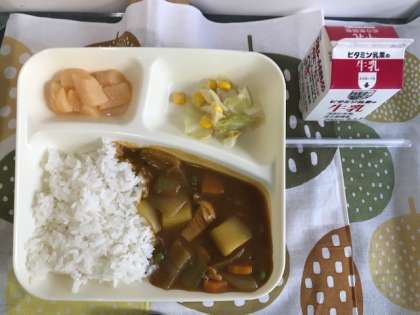 チキンカレーライス、キャベツとコーンのサラダ、白桃です。
