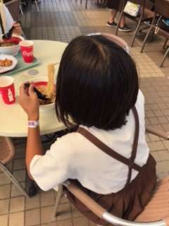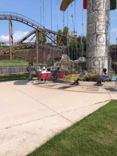 グループで、乗り物に乗ったり、ごはんを食べたり楽しんでいます