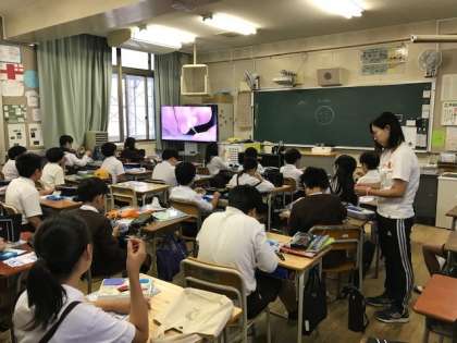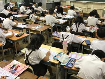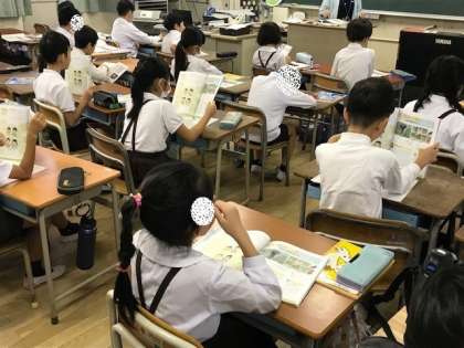 5年生の家庭科と1年生の国語と3年生の社会科の学習のようすです。