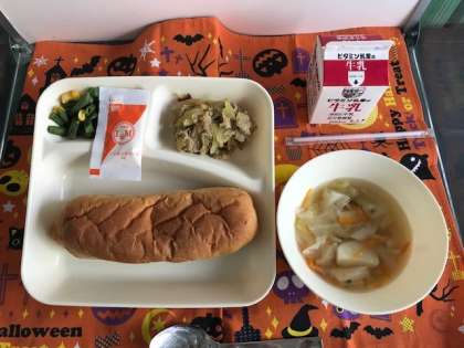 豚肉のカレー風味焼き、鶏肉と野菜のスープ、さんどまめとコーンのサラダです。