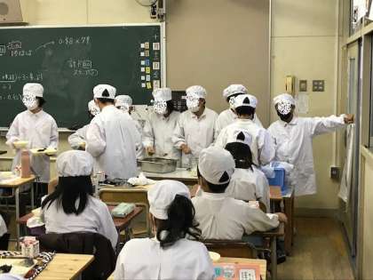 給食の準備は、5年生の教室です。