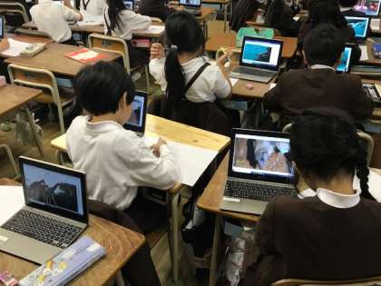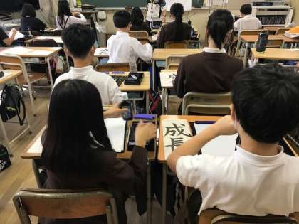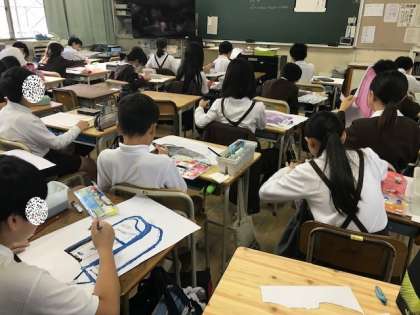 5年生の図工と習字と1年生の新聞づくりのようすです。