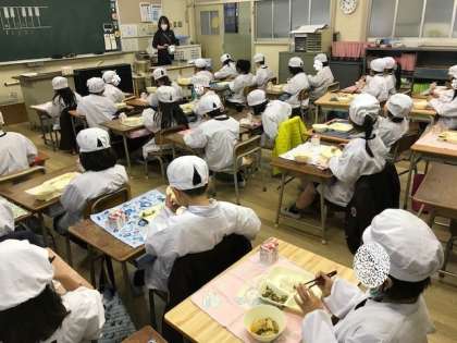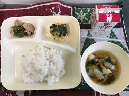 具だくさん卵の千草焼き、五目汁、豚肉とさんどまめのいためものです。