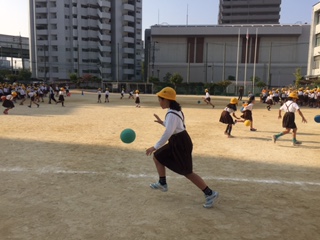学年によって、ボールの運び方が違います。例えば5年生は、スキップをしながらドリブルして運びます。