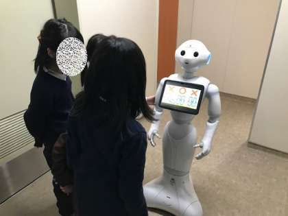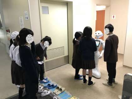 6年生の児童がペッパー君にトイレのスリッパの使い方をプログラミングをしました。