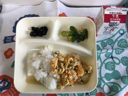 親子丼、ブロッコリーのごまあえ、黒豆の煮ものです。