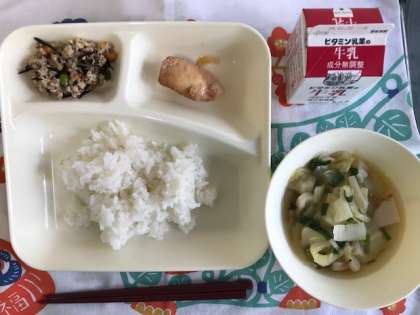 鶏肉の甘みそ焼き、五目汁、高野どうふのいり煮です。