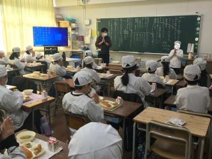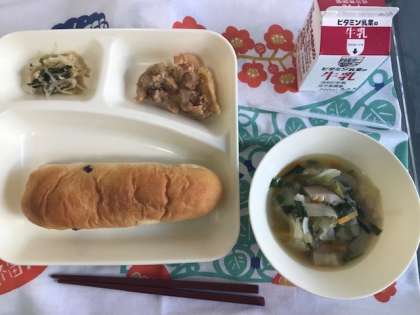 鶏肉のからあげ、中華スープ、チンゲンサイともやしの甘酢あえです。