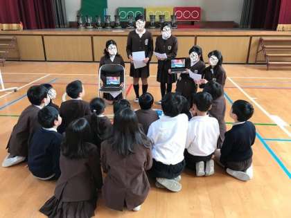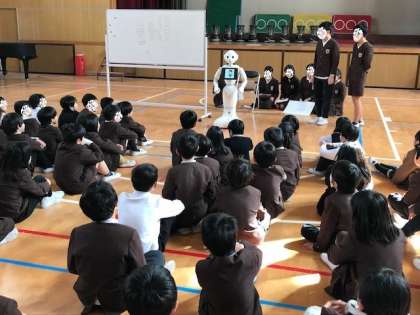6年生とペッパー君が3年生にインターネットのトラブルについて発表しました。