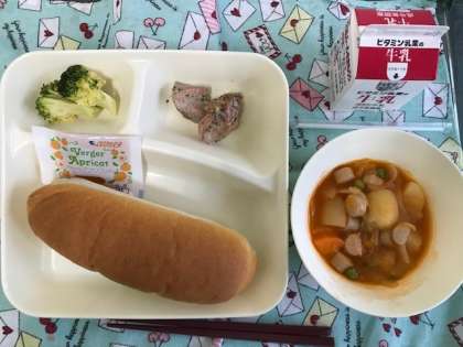 鶏肉のバジル焼き、ウインナーと野菜のケチャップ煮、ブロッコリーのサラダです。