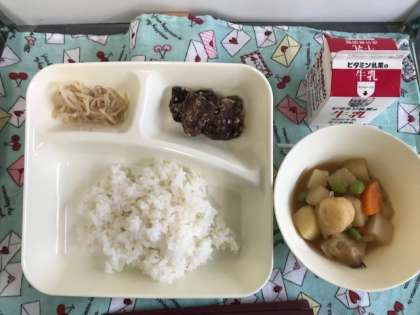 くじらのたつたあげ、まる天と野菜の煮もの、もやしのしょうがづけです。