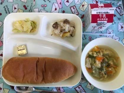 中華おこわ、卵スープ、キャベツのオイスターソースいためです。