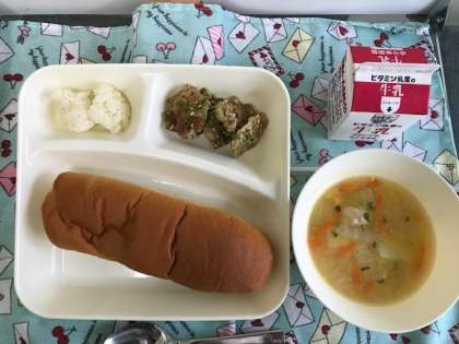 豚肉のカレー風味焼き、コーンとはくさいのスープ、カリフラワーのレモンドレッシングです。